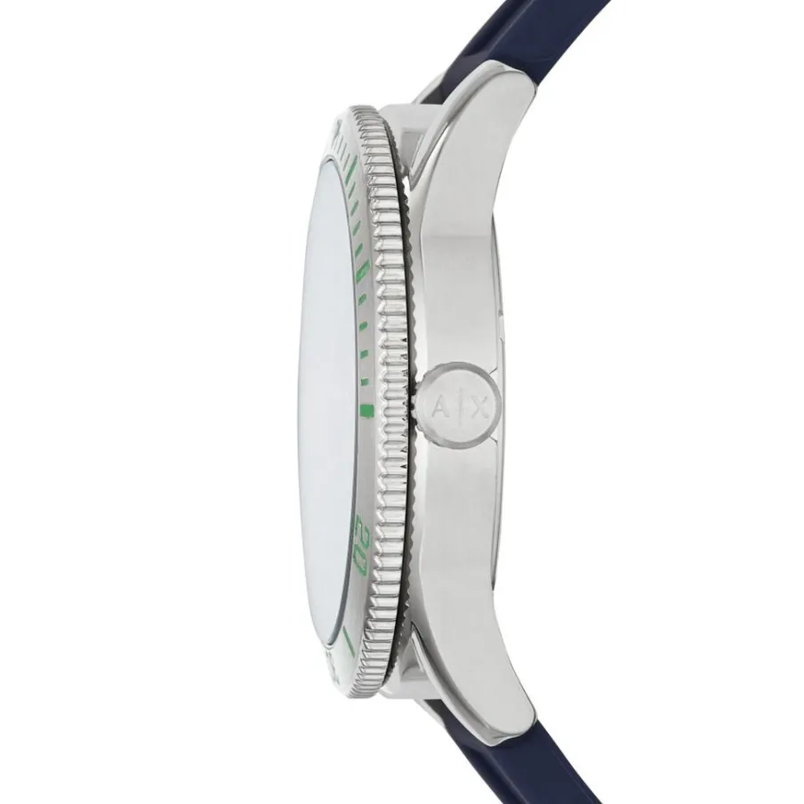 Montre Armani Exchange Acier Blanc Ronde Quartz 46mm Fond Noir Bracelet Silicone Bleu Ax1827