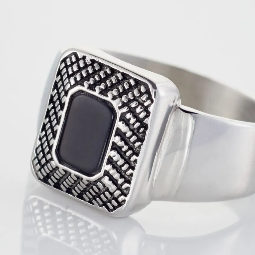 Bague Acier Vieilli Agate Noire Entourage Grave