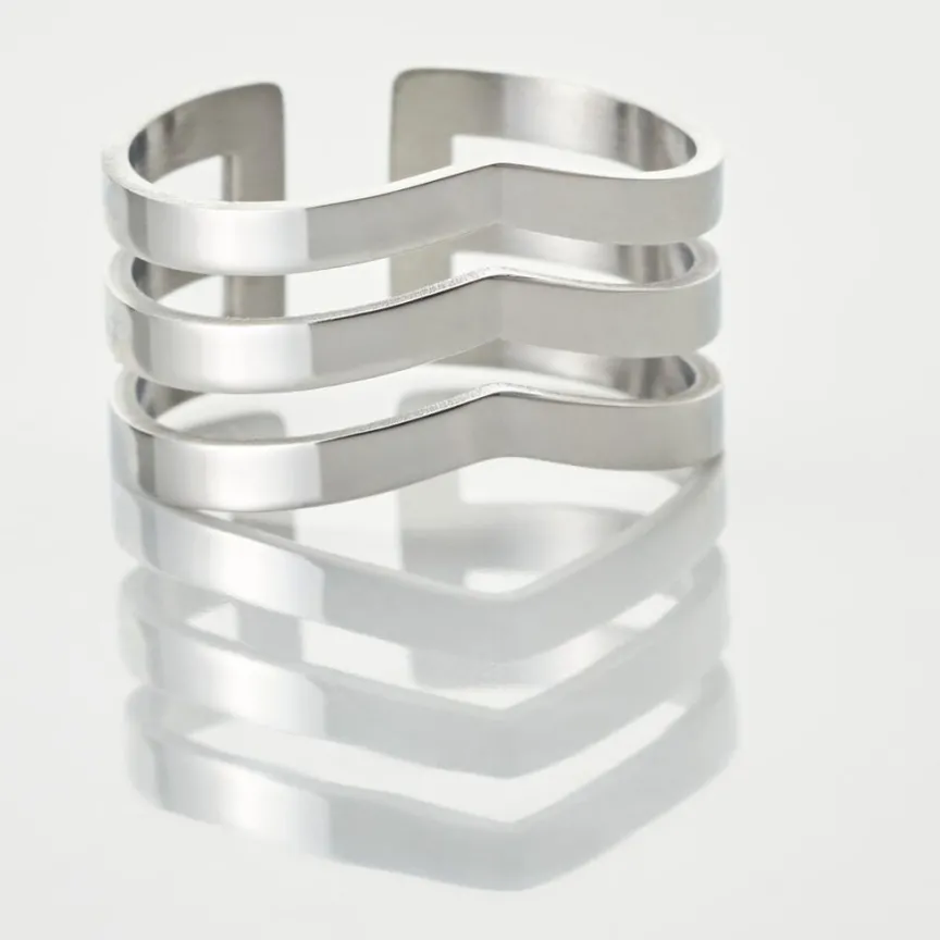 Bague Acier Blanc Triple Rang Ajoure Forme Aile De Mouette