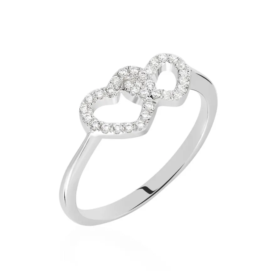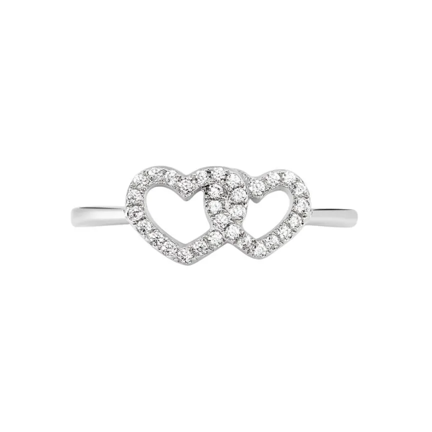 Bague Argent Blanc 925/1000 2 Coeurs Ajoures Entrelaces Pavage Oxydes De Zirconium