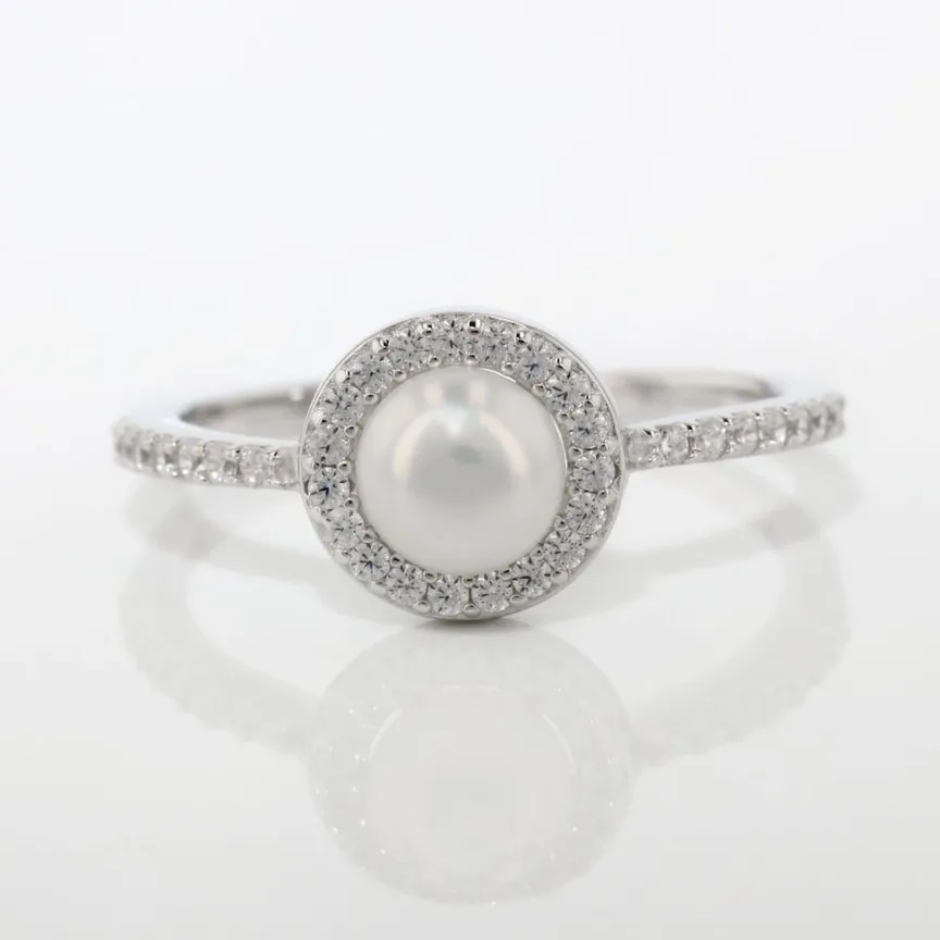 Bague Argent Blanc 925/1000 Perle De Culture 6mm Entourage Microsetting Oxydes De Zirconium