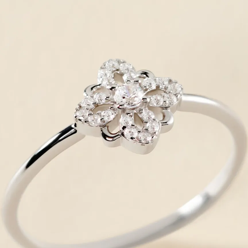 Bague Argent 925/1000 Fleur Pavage Oxyde De Zirconium