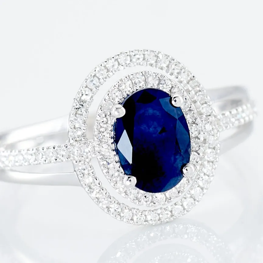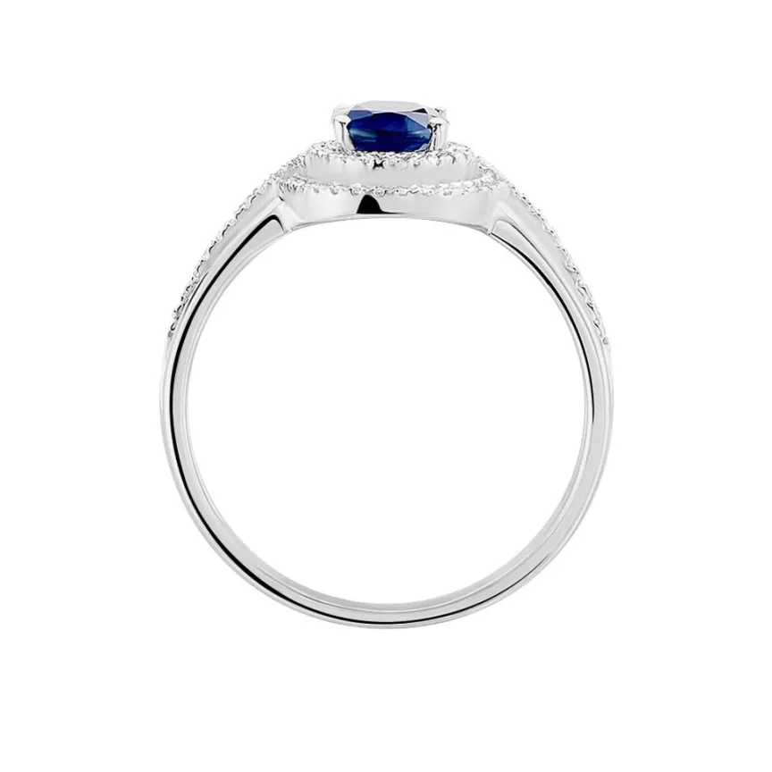 Bague Or Blanc 375/1000 Saphir Serti Griffes Entourage Diamants Corps Triple