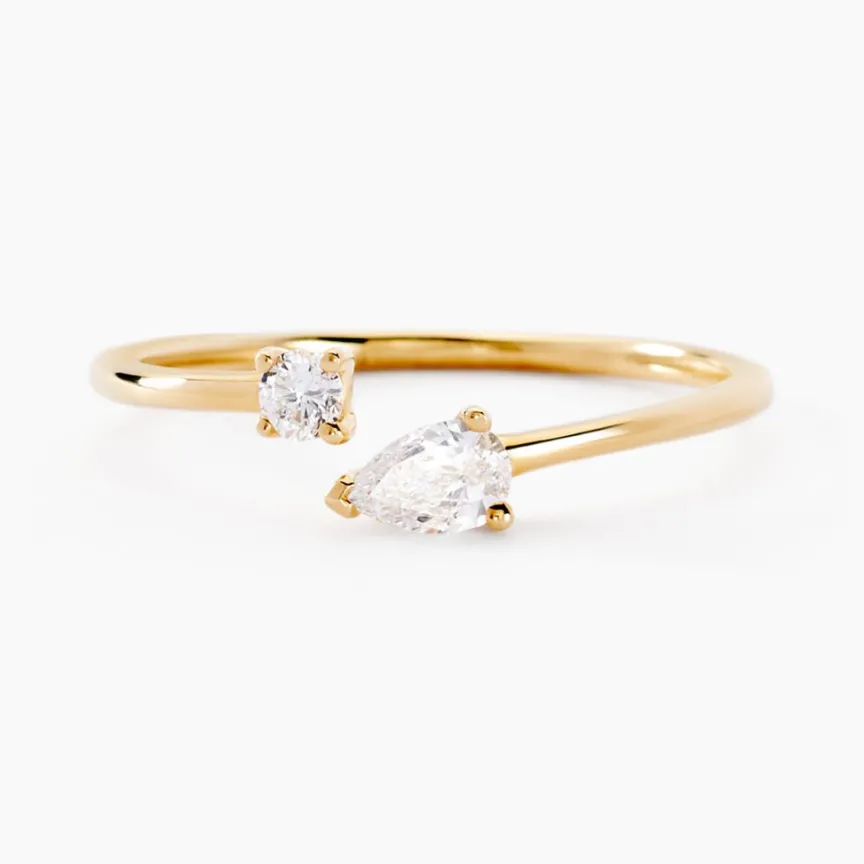 Bague Or Jaune 375/1000 Ouverte Diamants Synthetiques Poire 0.15cts Et Ronde Sertis Griffes