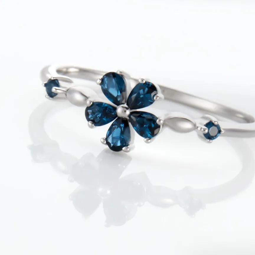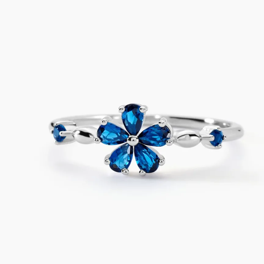 Bague Argent Blanc 925/1000 Fleur Serti Griffes Oxydes De Zirconium Bleus Accompagne Oxydes De Zirconium Bleus