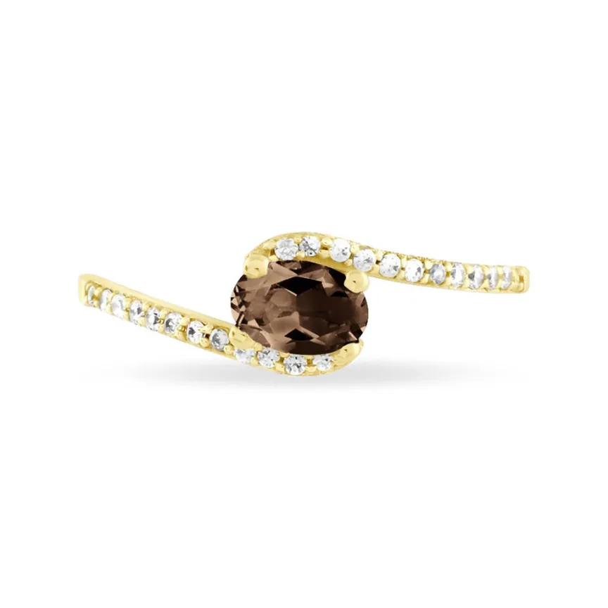 Bague Or Jaune 375/1000 Quartz Fume Central Et Oxydes De Zirconium