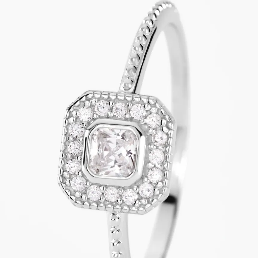 Bague Argent Blanc 925/1000 Oxyde De Zirconium Central Et Entourage Carré