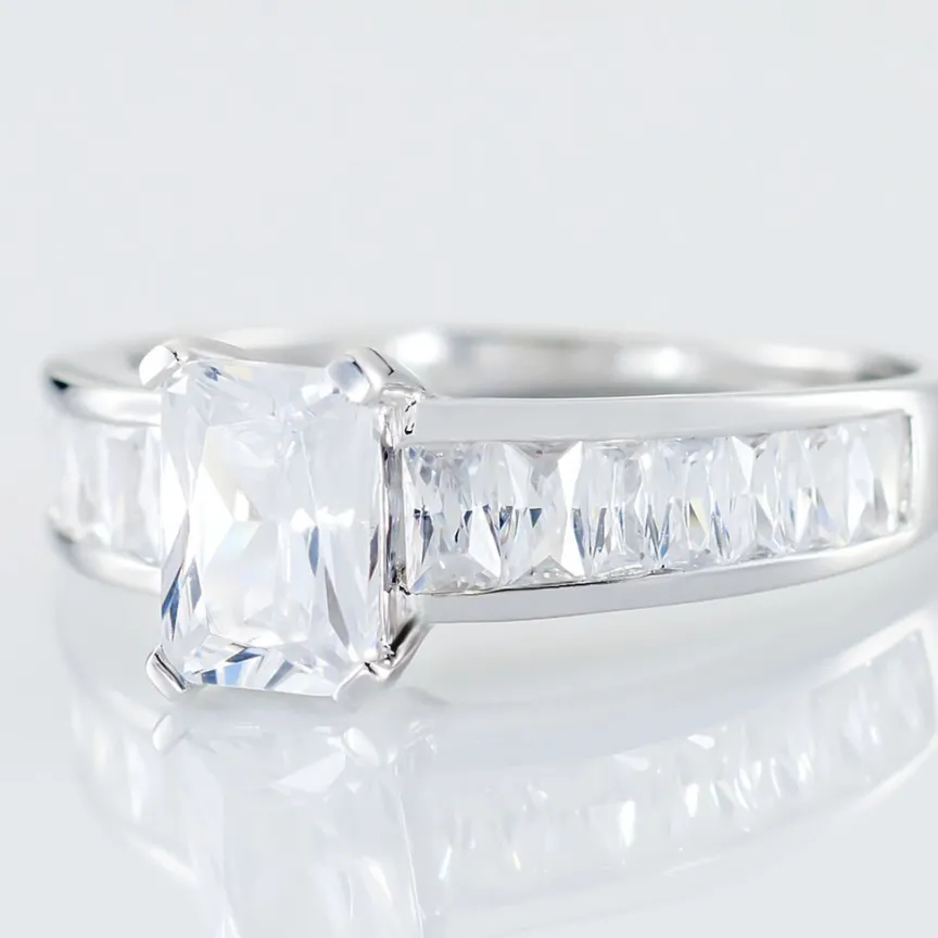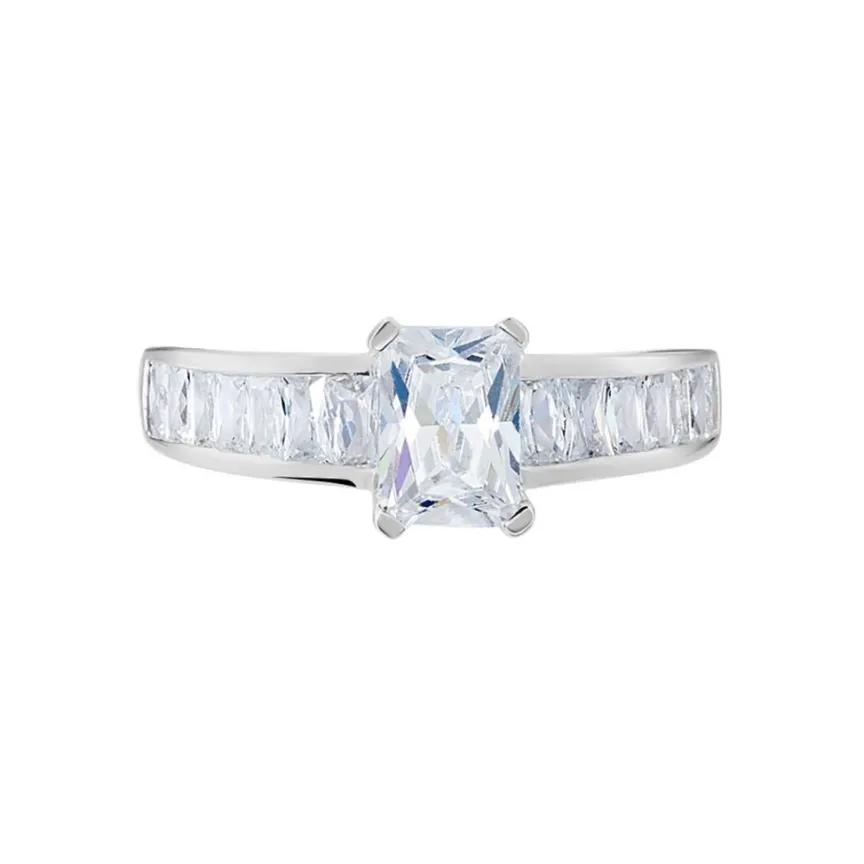 Bague Solitaire Argent Blanc 925/1000 Micro Setting Oxydes De Zirconium Taille Baguette