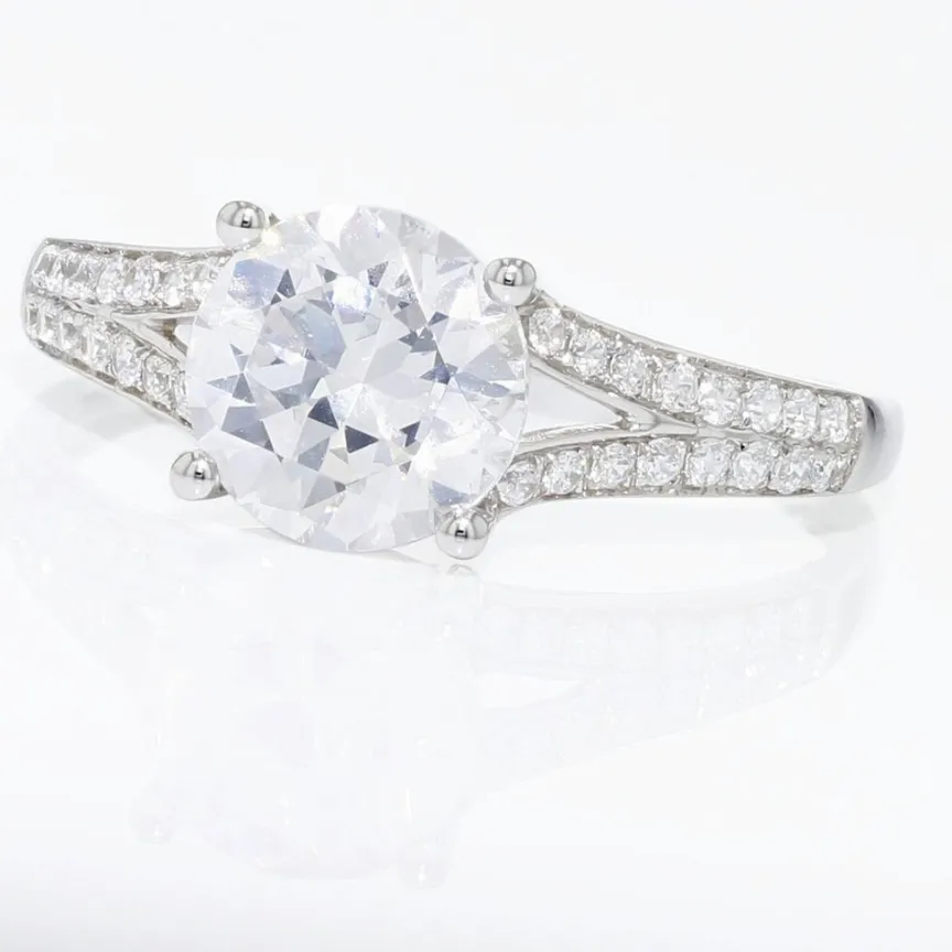 Solitaire Or Blanc 375/1000 Oxyde Central Et Corps De Bague Double Accompagne Oxydes