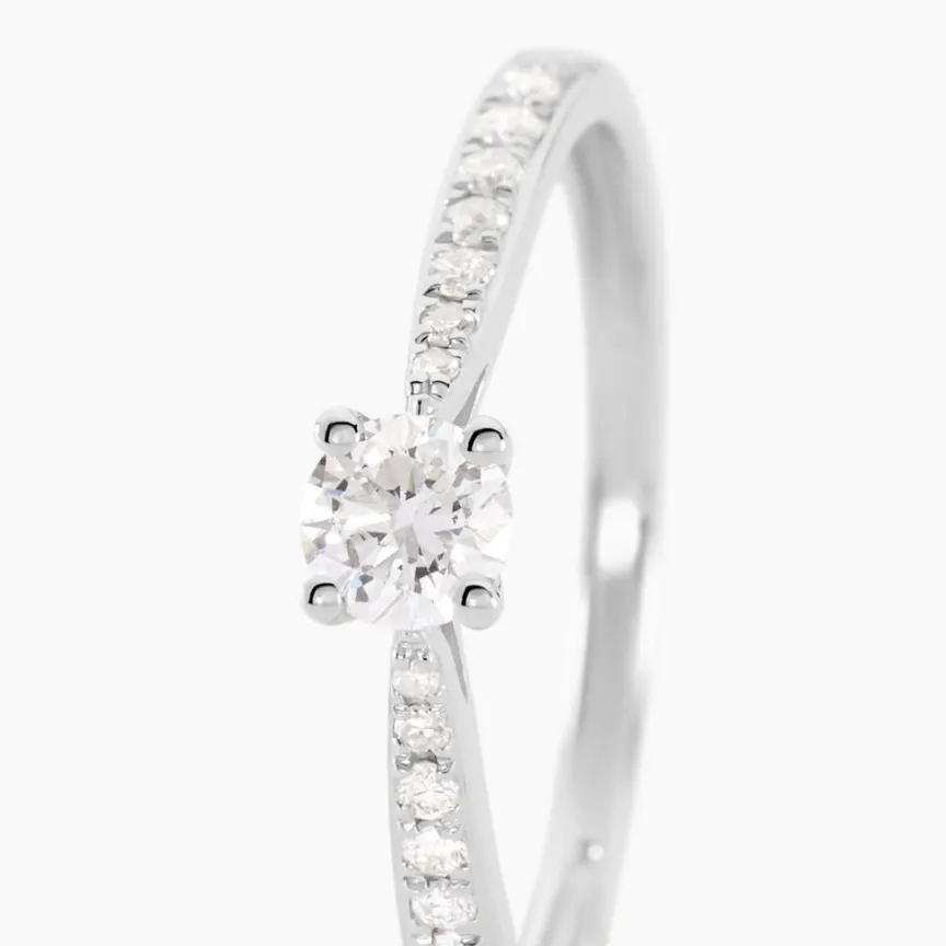 Solitaire Or Blanc 375/1000 Diamant Central 0.20cts Serti Griffes Accompagne Diamants