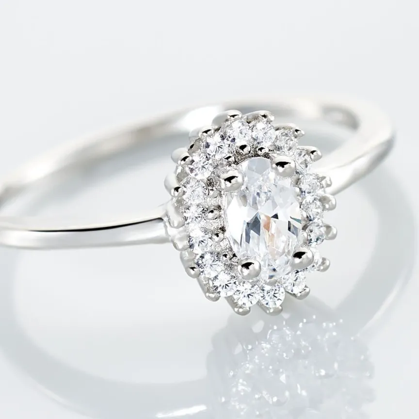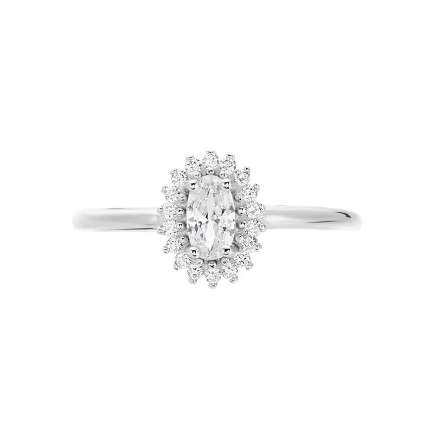 Solitaire Bague Argent Blanc 925/1000 Oxyde De Zirconium Central Forme Ovale Entourage Oxydes De Zirconium