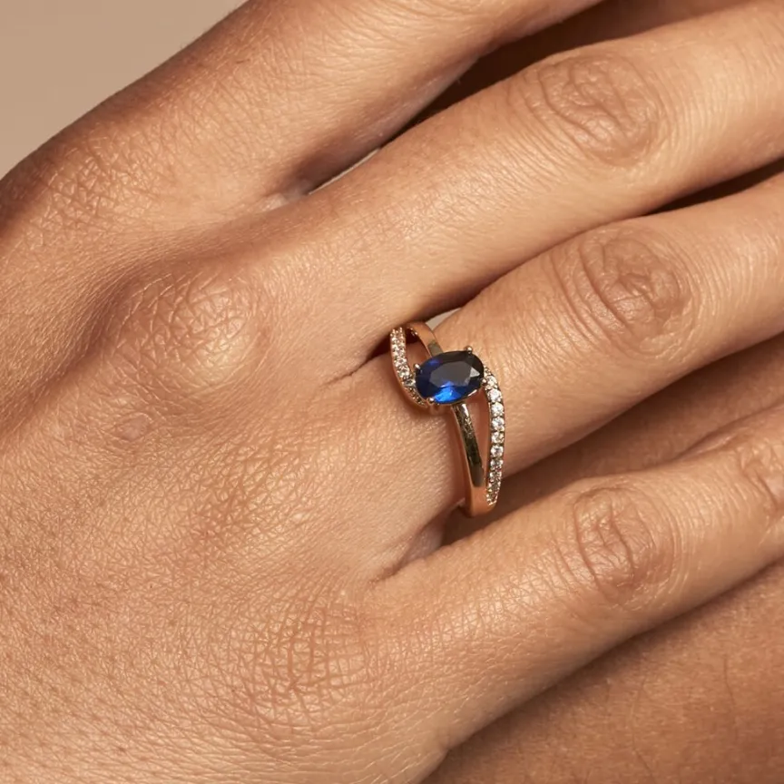 Bague Plaqué Or Jaune Vagues Oxydes De Zirconium Pierre Bleue
