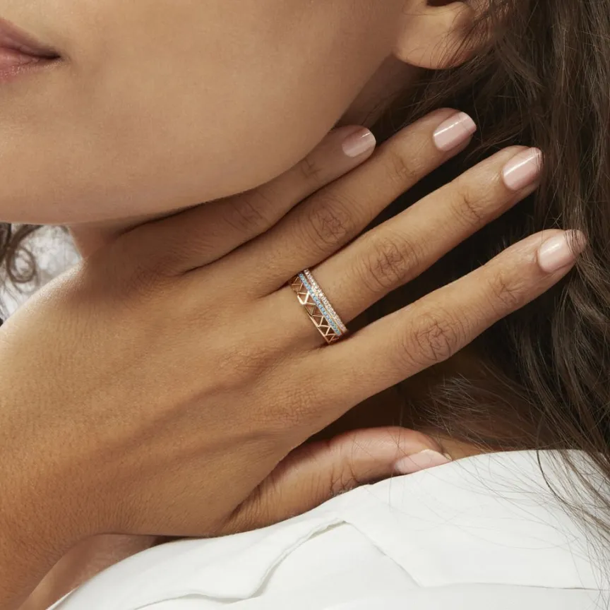 Bague Plaqué Or Jaune Motifs Mexicains Oxydes De Zirconium Et Pierres Bleues