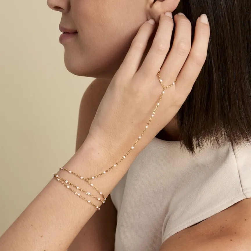 Bijou De Main Acier Inoxydable Jaune Boules Email Blanc Chaines Multitours Maille Forçat 50cm