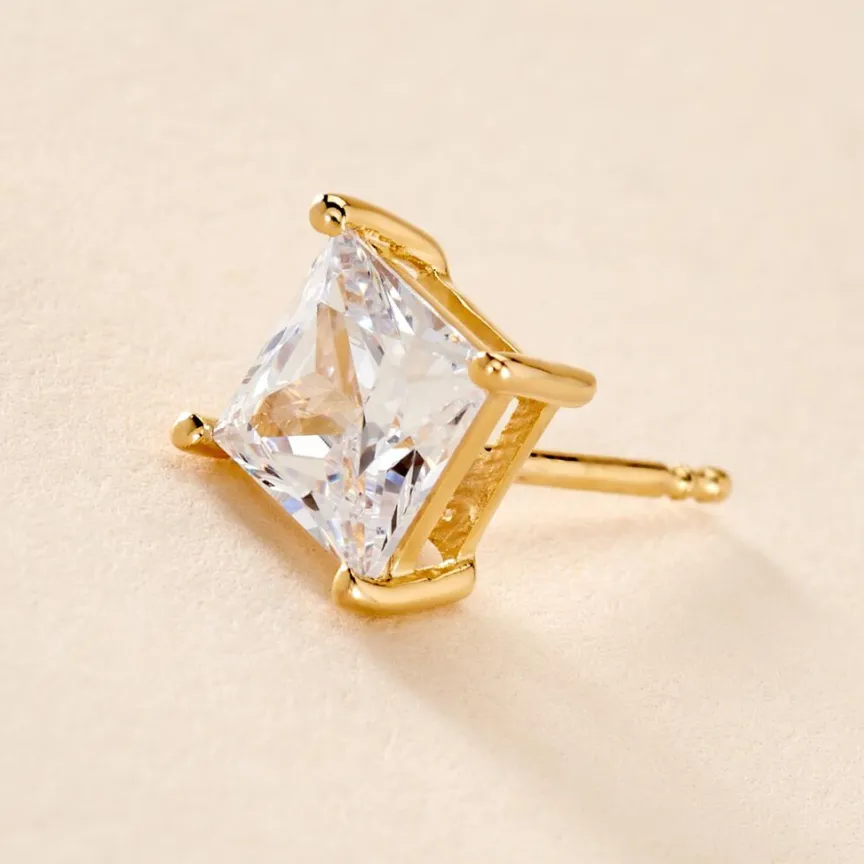 Boucle D’oreille Puce Unitaire Plaqué Or Jaune Oxyde De Zirconium Carré Serti 4 Griffes 4mm
