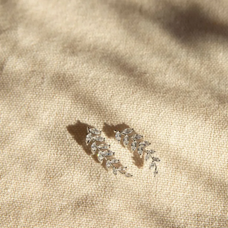 Boucles D’oreilles Grimpantes Argent Blanc 925/1000 Motifs Feuilles Oxydes De Zirconium