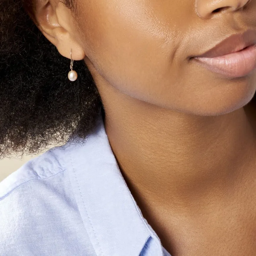 Boucles D’oreilles Pendantes Or Jaune 375/1000 Perles De Culture Rose 6.5/7mm