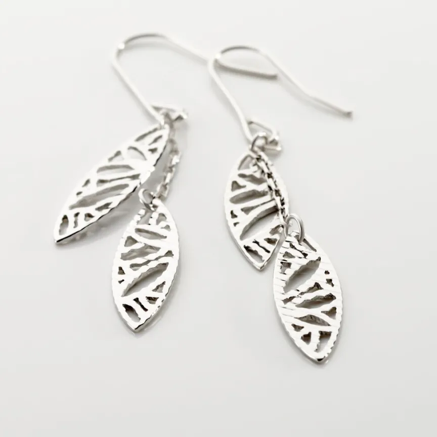Boucles D’oreilles Or Blanc 375/1000 Pendantes Feuille Eucalyptus