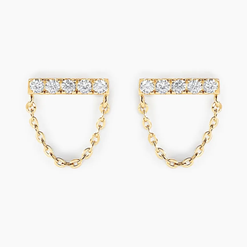 Boucles D’oreilles Pendantes Or Jaune 375/1000 Barre Oxydes De Zirconium Avec Chaine Sertis Griffes