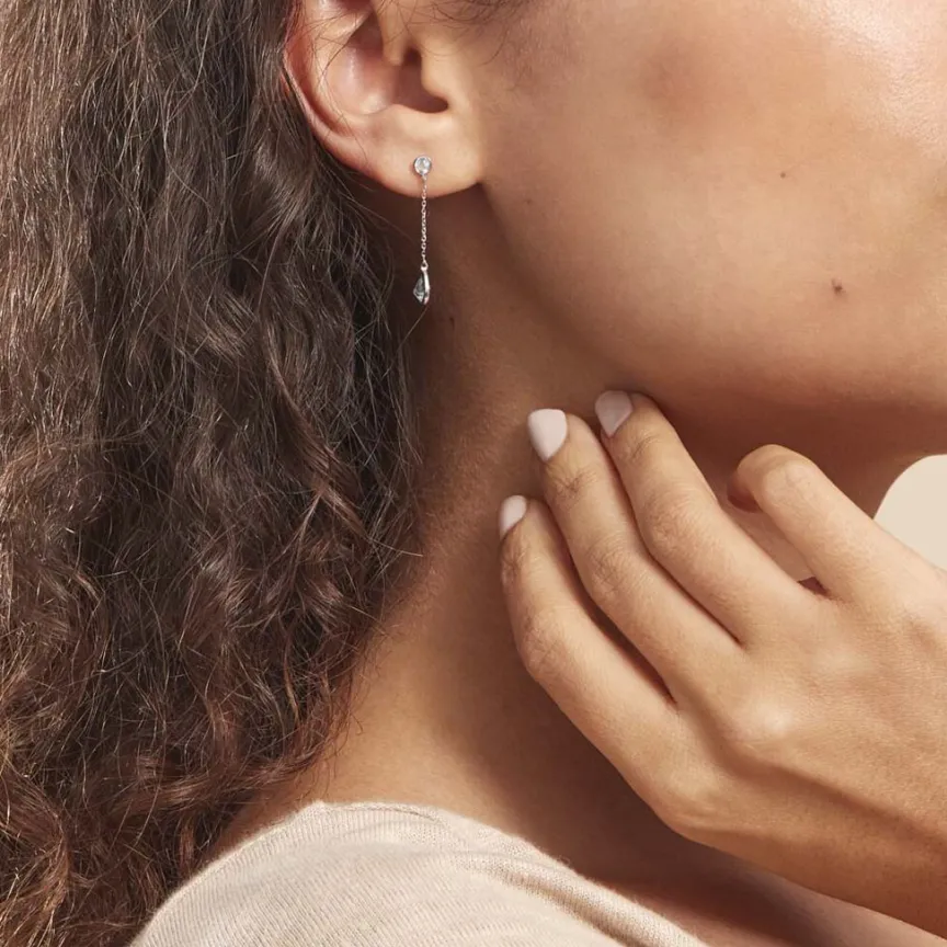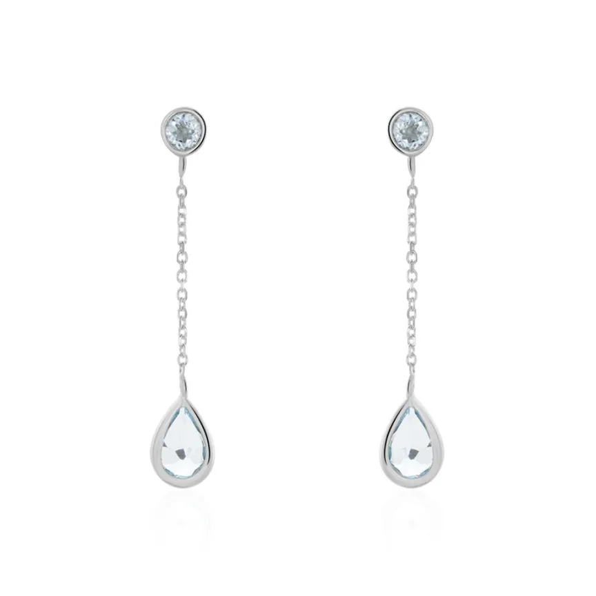 Boucles D’oreilles Or Blanc 375/1000 Pendantes Topazes Bleues Sur Chaine Maille Forçat