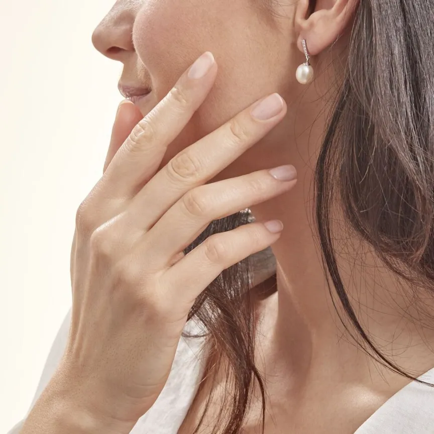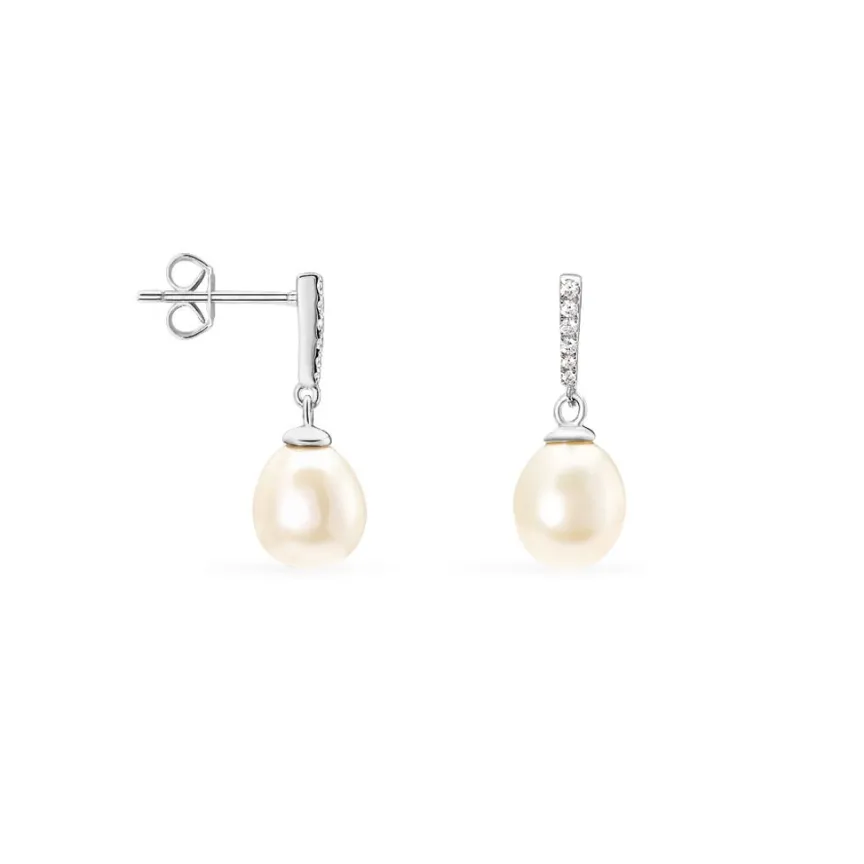 Boucles D’oreilles Pendantes Argent Blanc 925/1000 Perles De Culture Blanches 8/8.5mm Oxydes De Zirconium