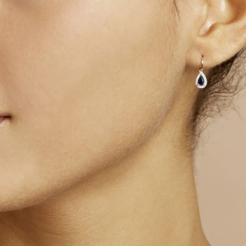 Boucles D’oreilles Or Jaune 375/1000 Dormeuses Saphirs Formes Poires Entourages Diamants