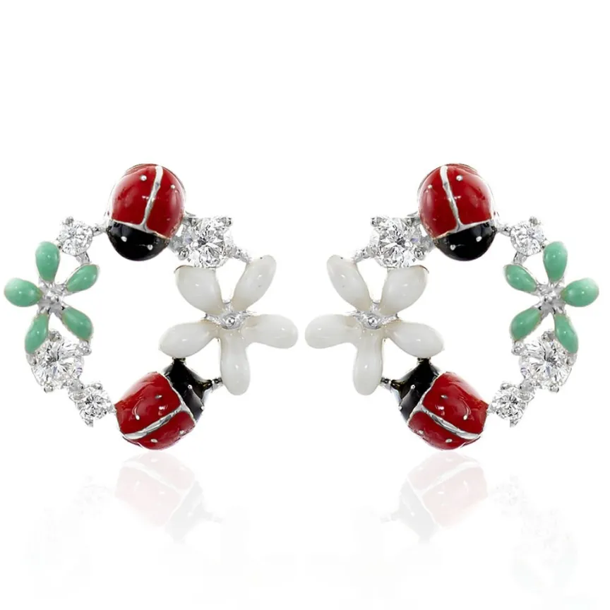 Boucles D’oreilles Argent Blanc 925/1000 Motifs Fleurs Et Coccinelles Email Rouge Blanc Et Vert+oxydes De Zirconium