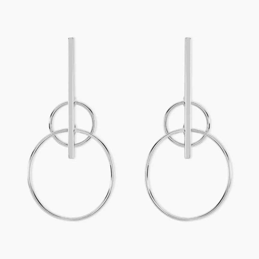 Boucles D’oreilles Pendantes Argent Blanc 925/1000 Double Cercles Ajoures + Barres Verticales