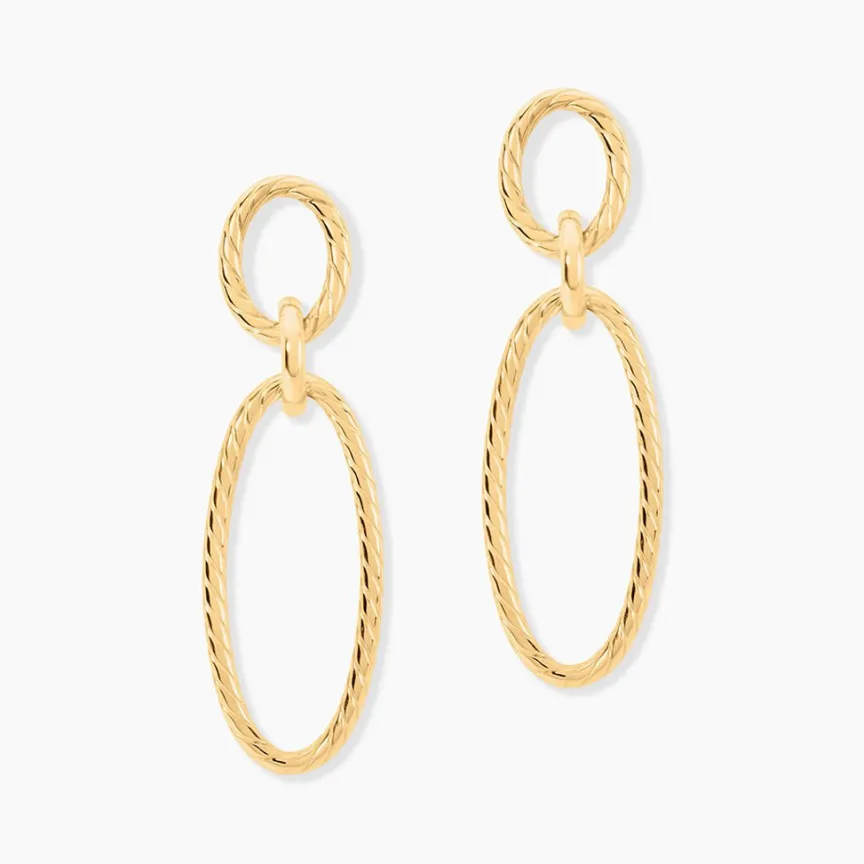 Boucles D’Oreilles Pendantes Or Jaune 750/1000 Double Maillon Oval Ajoure Strie Longueur 5Cm