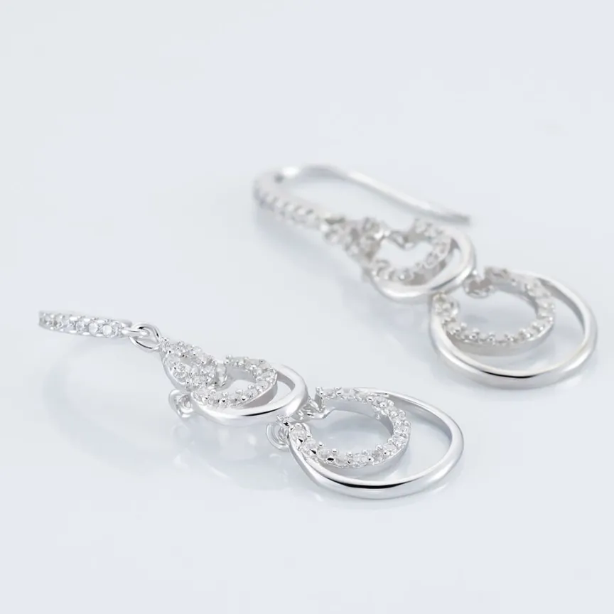 Boucles D’oreilles Pendantes Argent Blanc 925/1000 Cercles Ajoures Pavage Oxydes De Zirconium