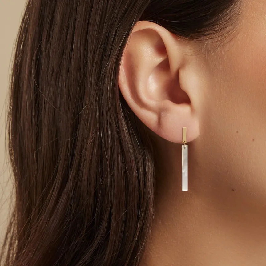 Boucles D’oreilles Pendantes Or Jaune 375/1000 Barres Rectangles Nacre Blanches