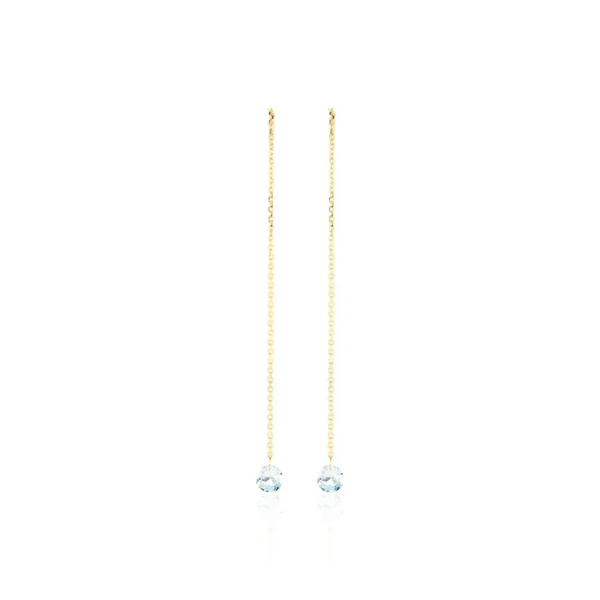 Boucles D’oreilles Pendantes Or Jaune 375/1000 Topaze Azur Ronde Percée