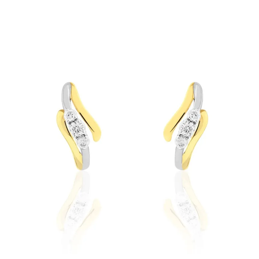 Boucles D’oreilles Or Bicolore 375/1000 Trilogie Vague Diamants 0.122cts
