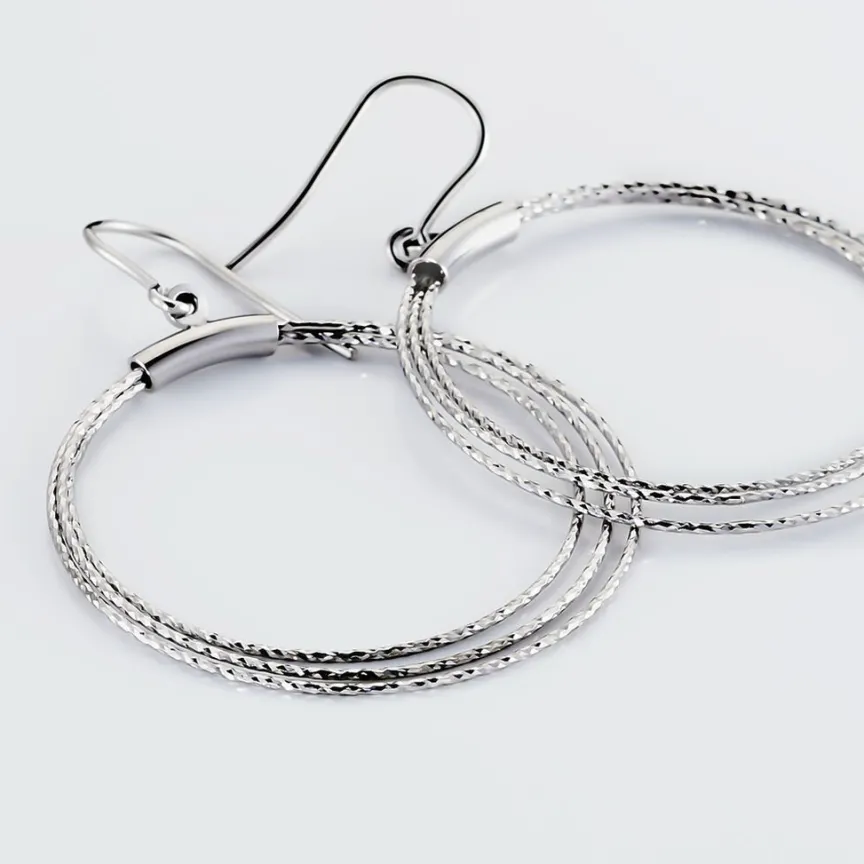 Boucles D’oreilles Pendantes Argent Blanc 925/1000 Cercles Multiples Ajoures Effets Diamantes