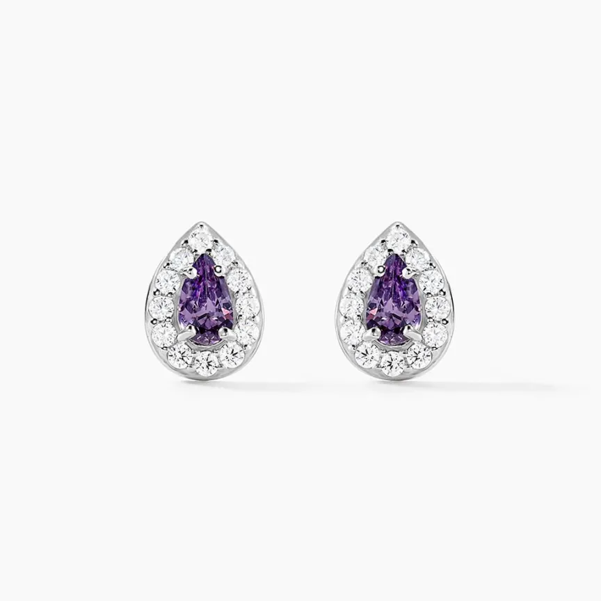 Boucles D’oreilles Puces Argent Blanc 925/1000 Gouttes Violettes Entourage Sertis Griffes Oxydes De Zirconium