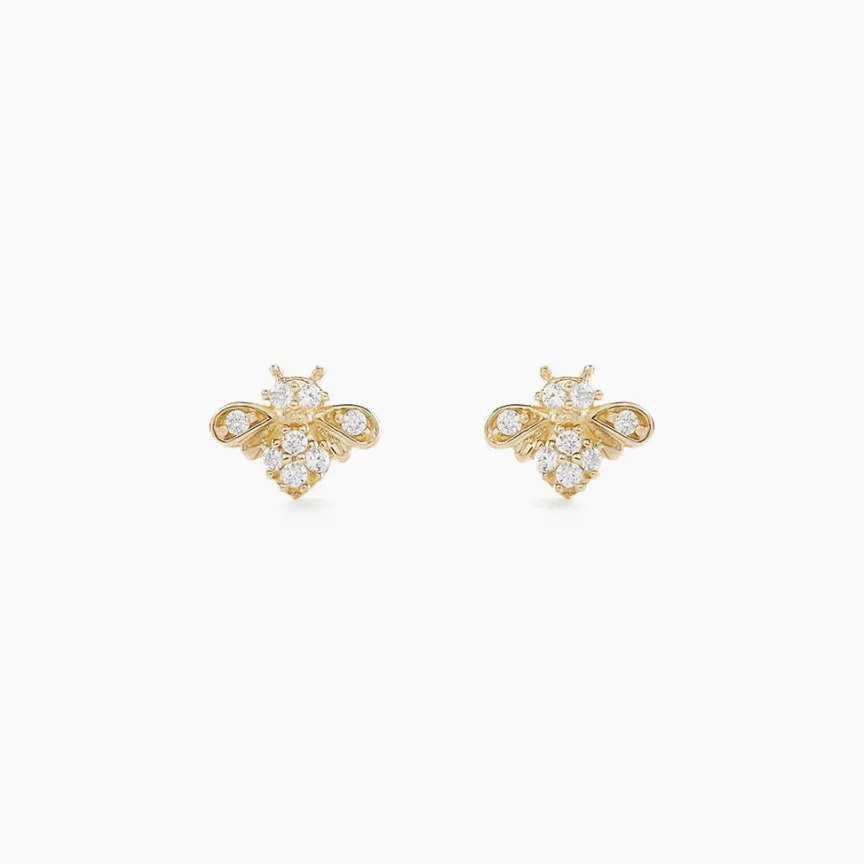 Boucles D’oreilles Puces Or Jaune 375/1000 Abeilles Pavage Oxydes De Zirconium