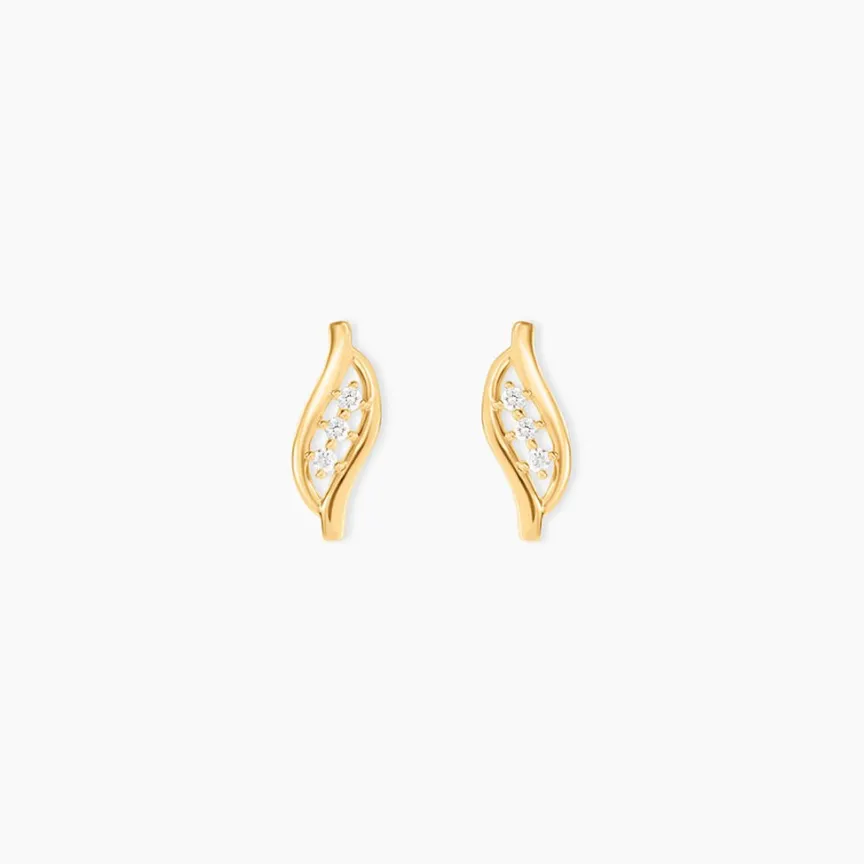 Boucles D’oreilles Or Jaune 375/1000 Feuille D’or Trilogie Diamants 0.0724cts