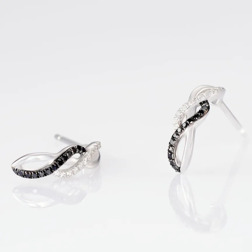 Boucles D’oreilles Or Blanc 375/1000 Forme Vague Double Diamants Blancs Et Noirs