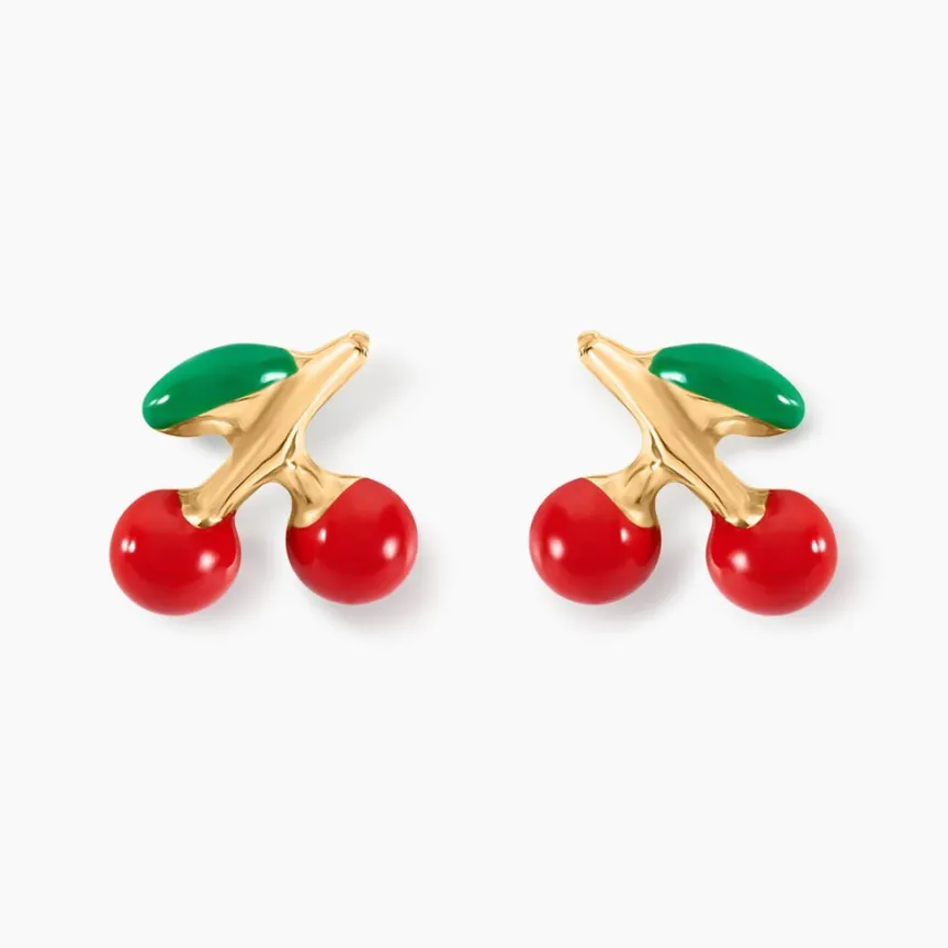 Boucles D’oreilles Or Jaune 375/1000 Cerises Smalto Vert Et Rouge