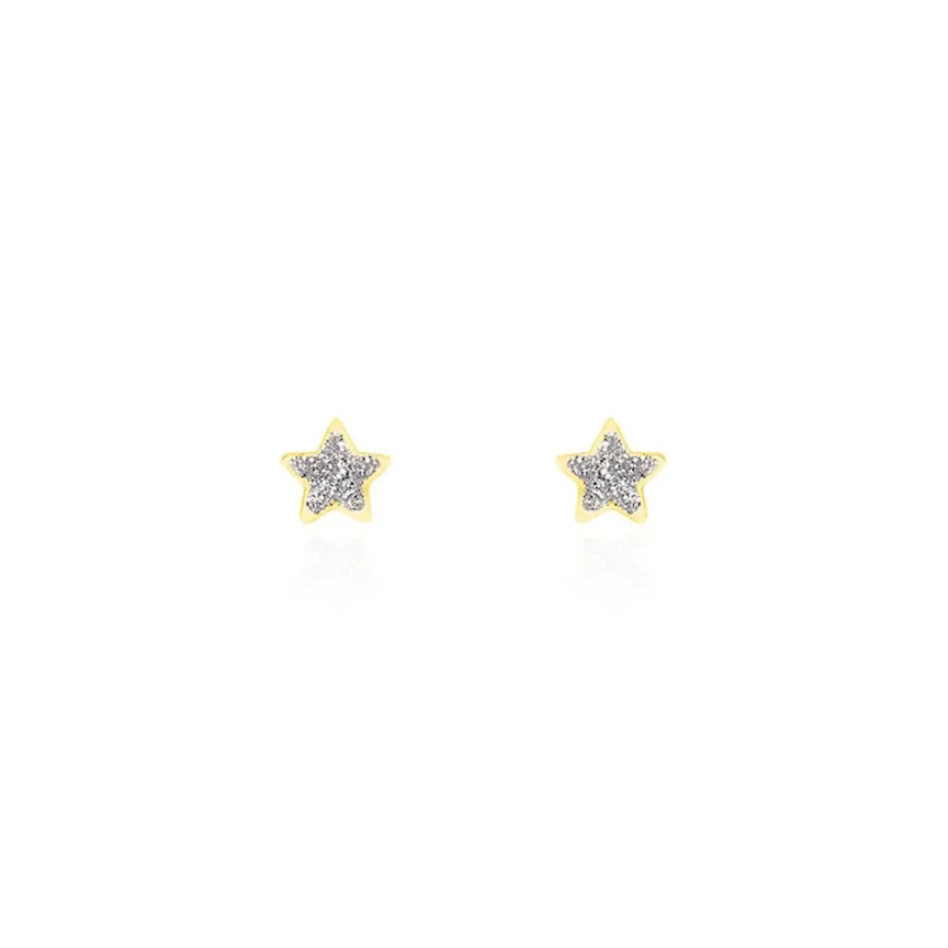 Boucles D’oreilles Or Jaune 375/1000 Puces Motifs Etoiles Glitter Silver