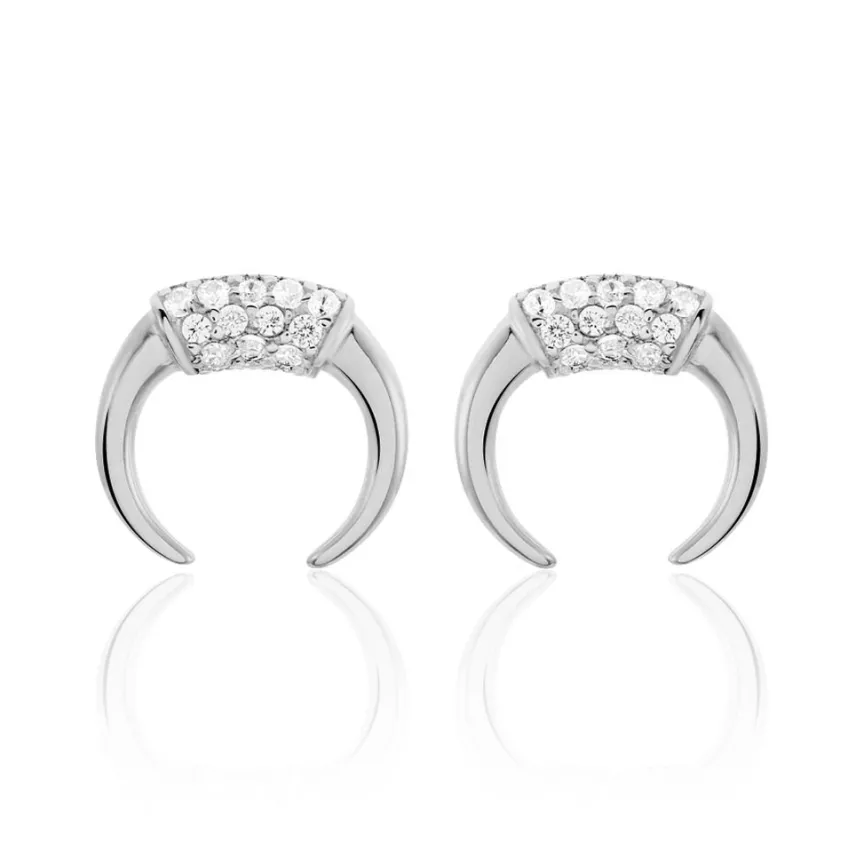 Boucles D’oreilles Puces Argent Blanc 925/1000 Motifs Cornes Pavage Oxydes De Zirconium
