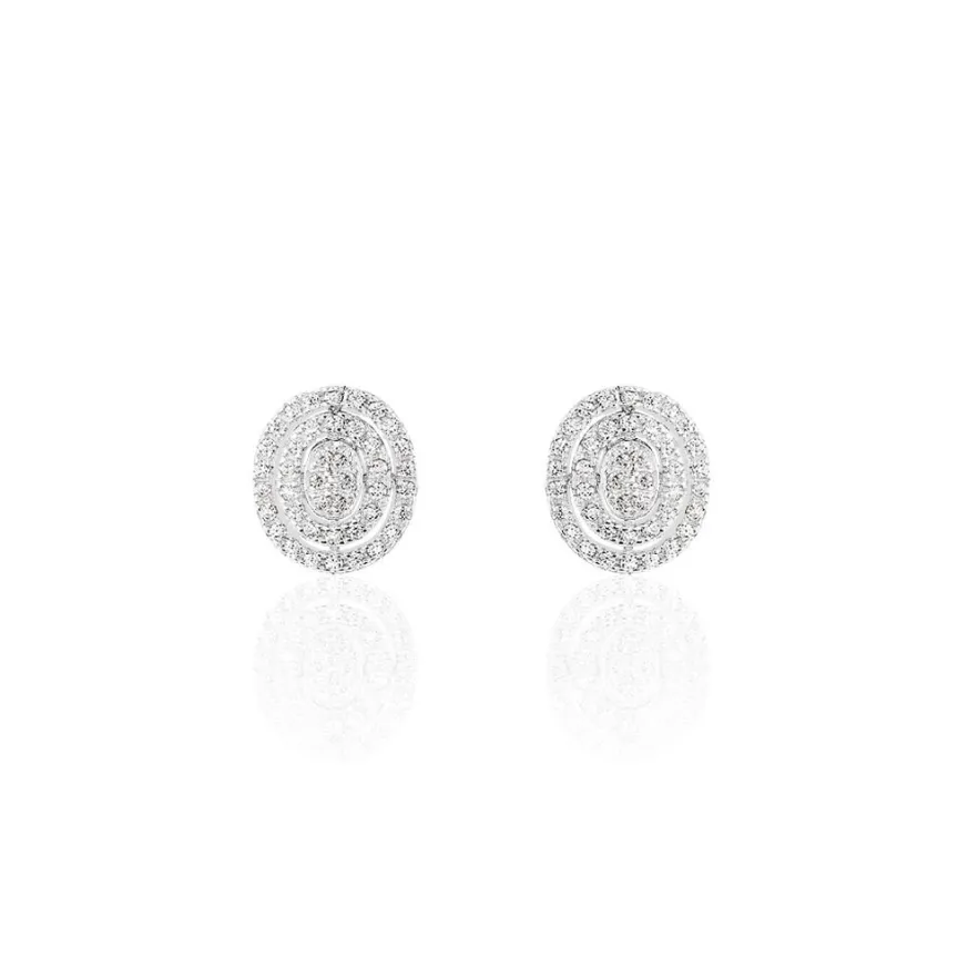 Boucles D’oreilles Puces Argent Blanc 925/1000 Entourages Ajoures Formes Ovales Pavage Oxydes De Zirconium