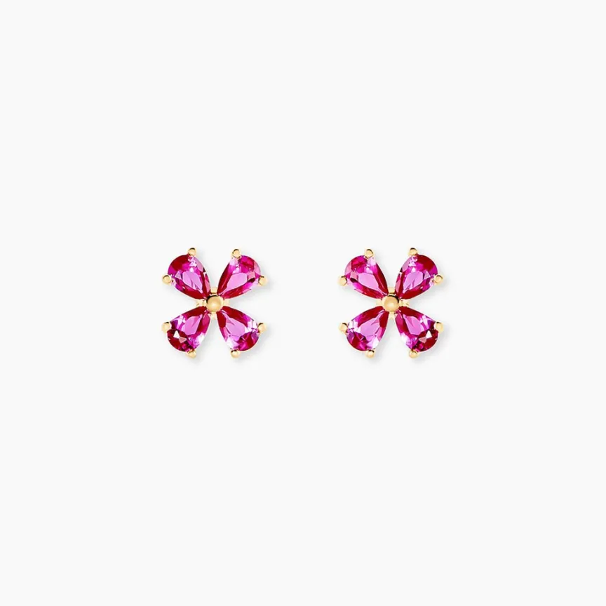 Bo Puces Or Jaune 375/1000 Fleur Oxyde De Zirconium Fuschia Serti 3 Griffes