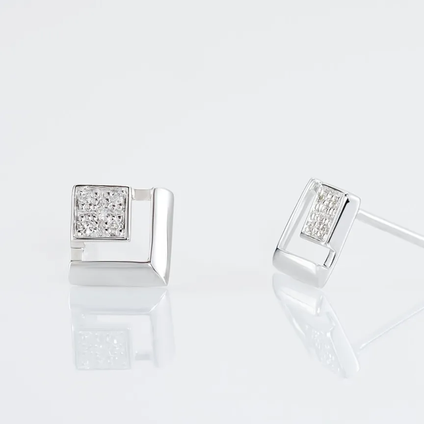 Boucles D’oreilles Or Blanc 375/1000 Puces Formes Losanges Ajoures + Semi Pavage Diamants