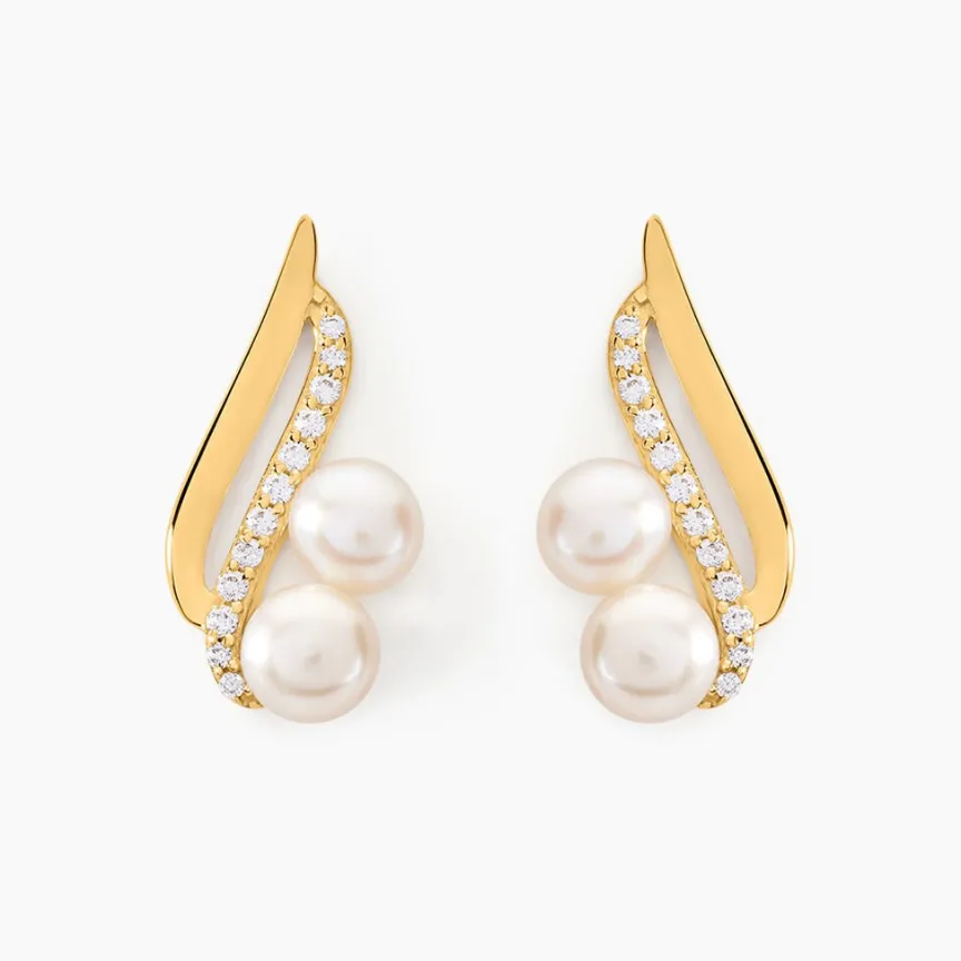Boucles D’oreilles Or Jaune 375/1000 Formes Vagues Perles De Culture 4mm Et Oxydes De Zirconium