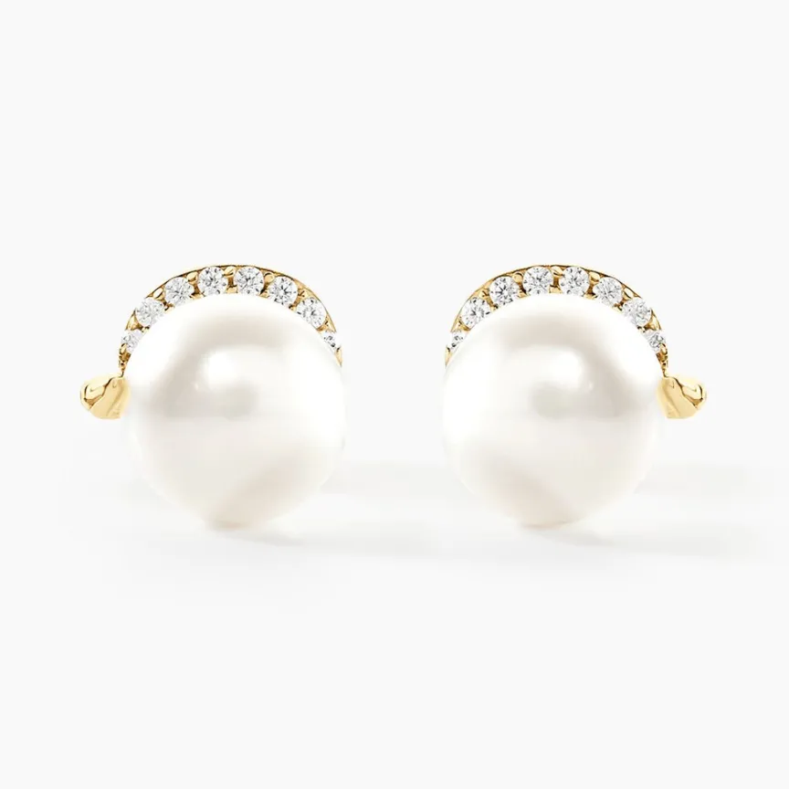 Boucles D’oreilles Or Jaune 375/1000 Puces Perles De Culture 7mm Spirale Oxydes De Zirconium