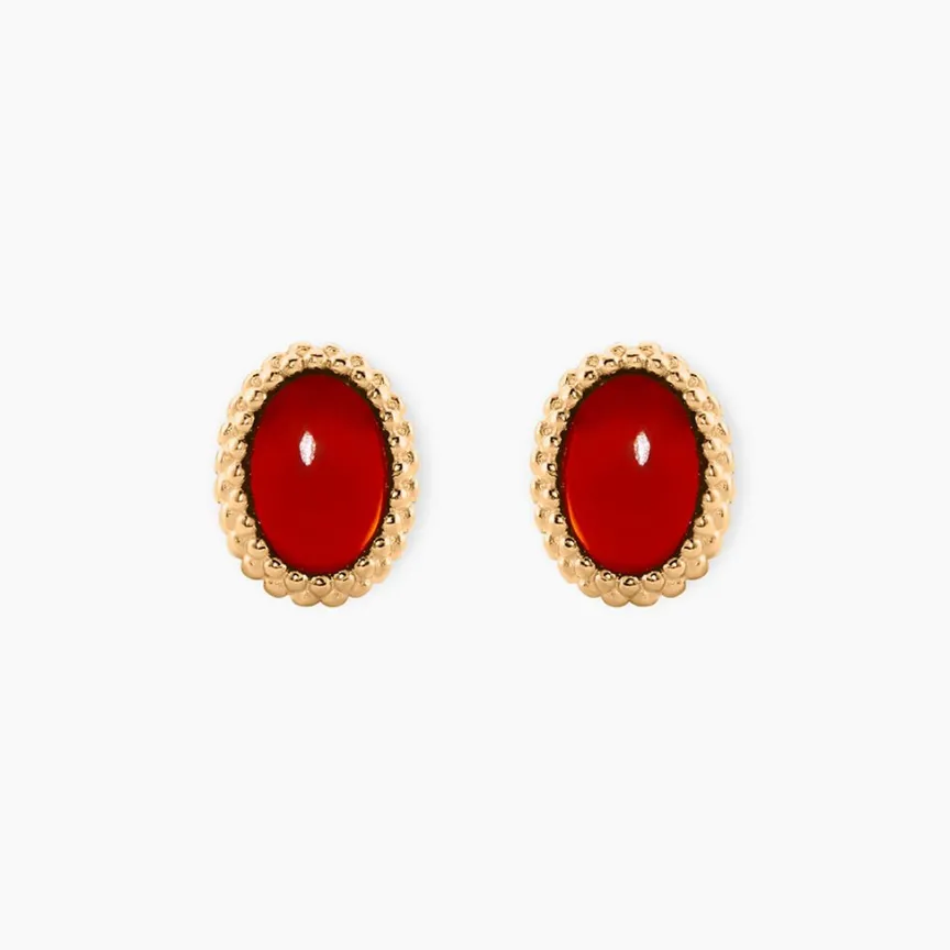 Boucles D’Oreilles Puces Plaqué Or Jaune Cabochons Ovales Pierres Rouges