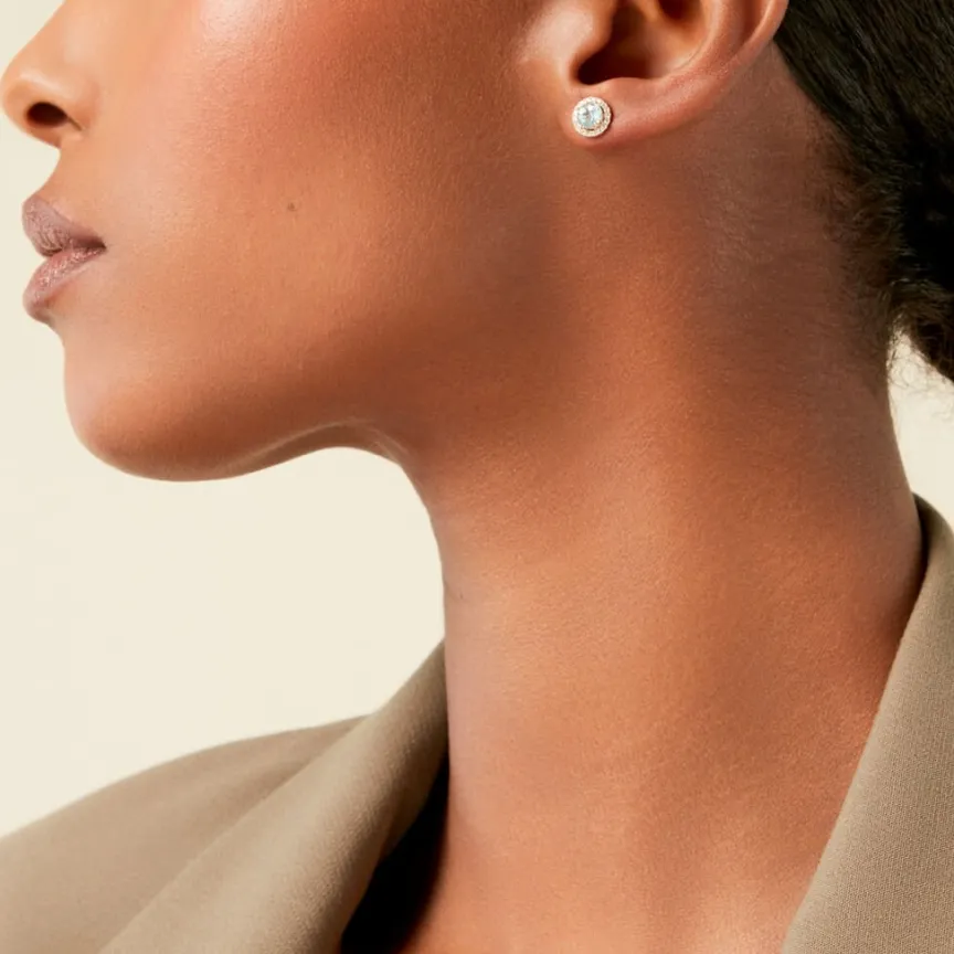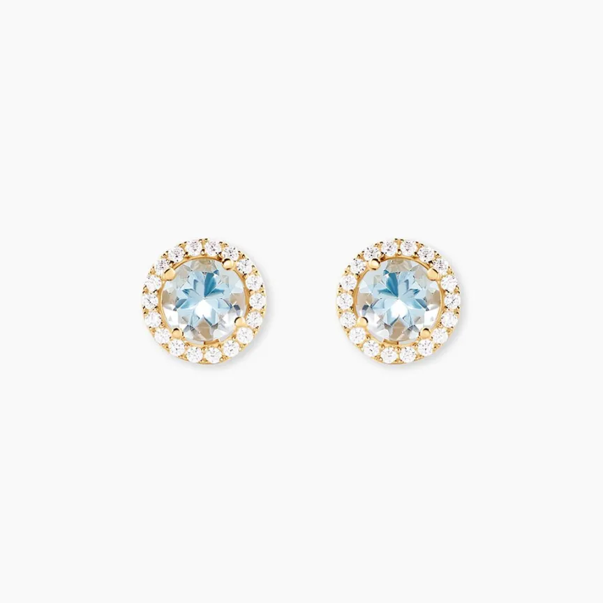 Boucles D’Oreilles Puces Or Jaune 375/1000 Solitaire Topaze Sky 0,8Cts Sertis 4 Griffes Entourage Oxyde De Zirconium