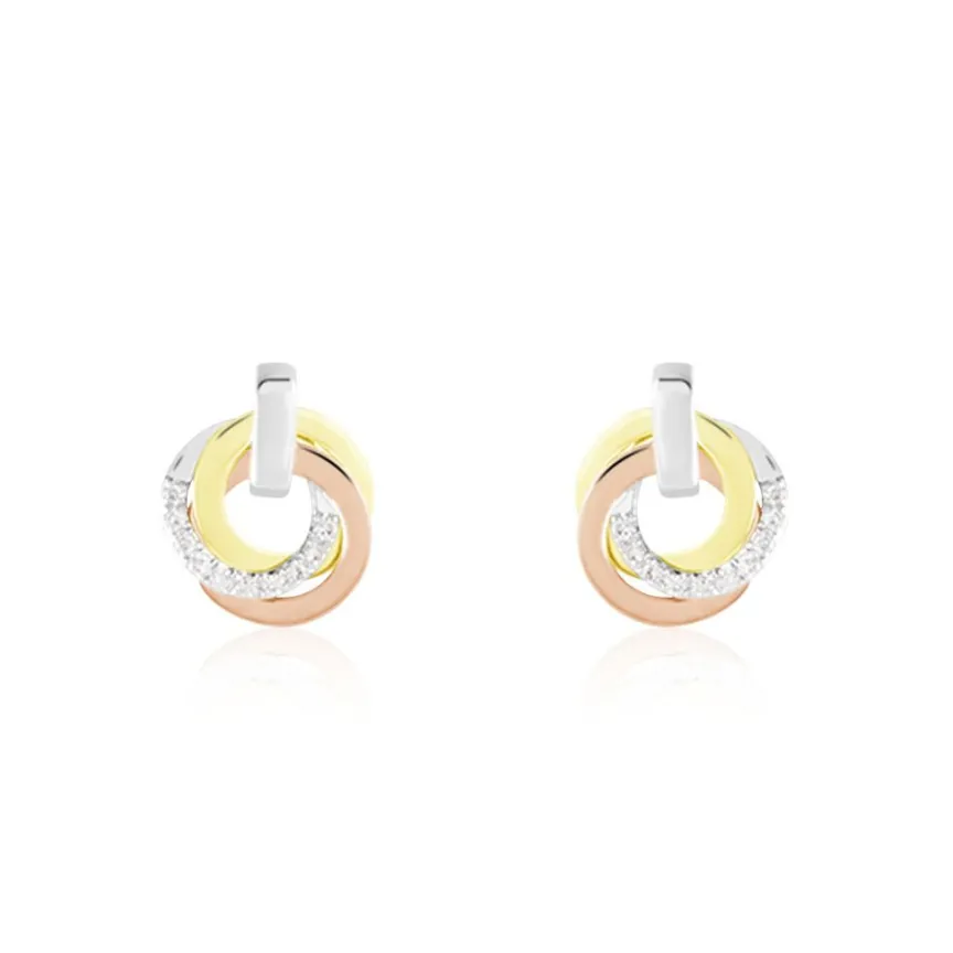 Boucles D’oreilles Puces Or Tricolore 375/1000 Forme Cercles Entrelaces Pavage Diamants