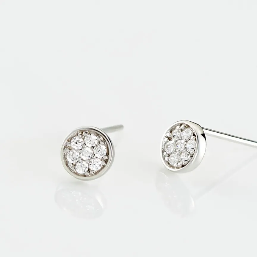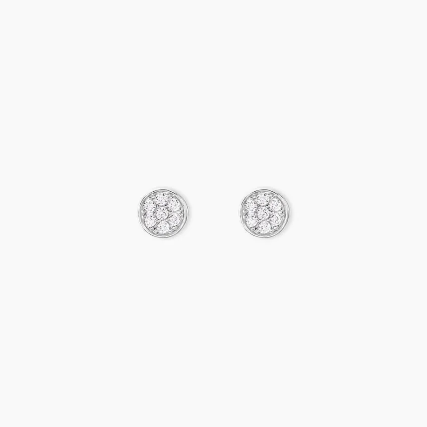 Boucles D’oreilles Or Blanc 375/1000 Puces Formes Pastilles Pavées Oxydes De Zirconium Serti Clos